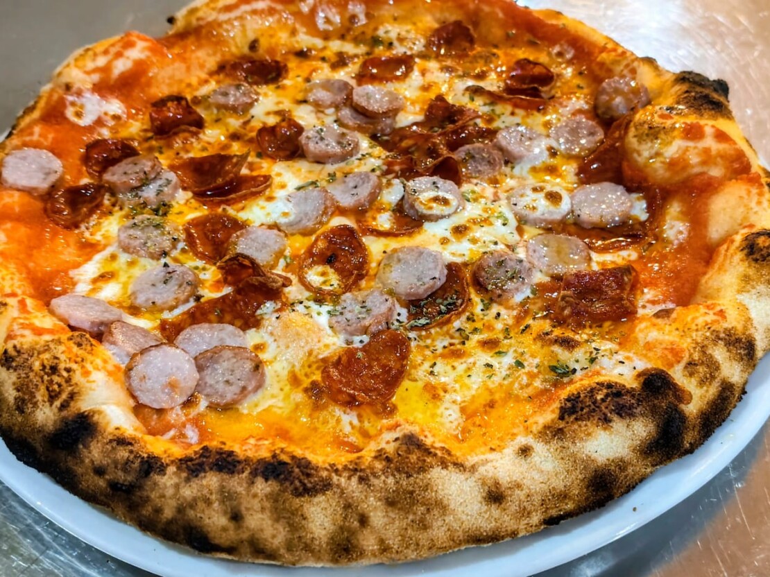 Salsa de tomate, queso mozzarella, chorizo picante, salchicha, guindilla y orégano.