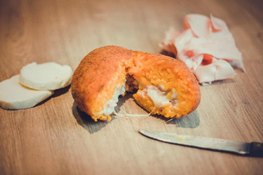 Mini arancina de morcilla de Villada rellena de mozzarella di bufala.
