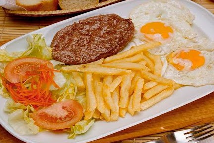 Filete de ternera, 1 huevo frito, patatas fritas, pimientos, chorizo frito o morcilla. 12,50 €