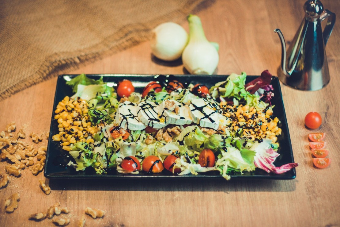 Lechuga, escarola, tomate cherry, cebolleta, maíz, queso de cabra, nueces, salsa balsámica de módena, aceite. 13,90 €