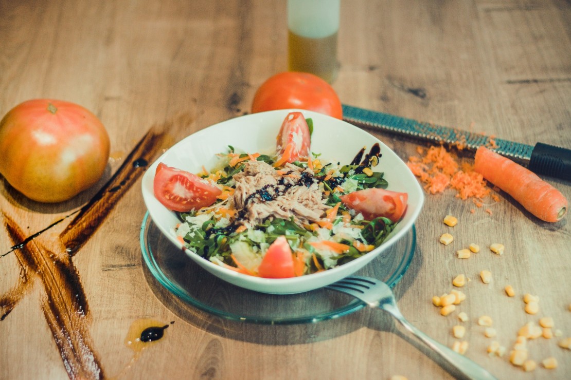 Lechuga, rúcula, zanahoria, maíz, tomate, queso parmigiano, atún. 10,80 €