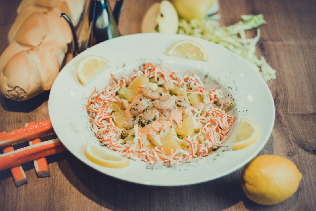 Lechuga, piña, manzana, gambas, surimi, picatostes y salsa rosa. 14,50 €