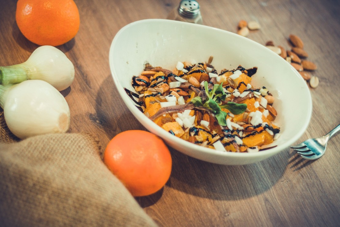 Naranja, anchoas, cebolleta, frutos secos, salsa balsámica de módena, sal, pimienta negra. 11,50 €